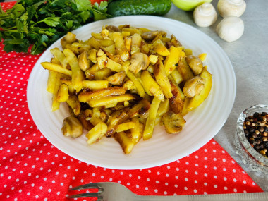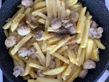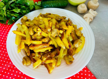 Захотелось жареной картошки и тут мне попался рецепт картошки жаренной с грибами и луком, решила поэкспериментировать. Мелко нарезала лук и отправила обжариваться на растительном масле. Шампиньоны у меня были мелкие, разрезала их пополам и когда лук стал прозрачного цвета отправила к нему шампиньоны. Картошку порезала соломкой и промыла в холодной воде. Добавлять к грибам с луком не стала, решила поджарить отдельно. Когда картошка подрумянилась и стала чуть мягкой добавила к ней грибы, посолила, добавила приправу для картофеля, черный молотый перец, накрыла все крышкой и жарила на медленном огне 5-7 минут, за это время картофель полностью приготовился. Вкусная, поджаристая картошечка получилась, еще и в сочетании с сочными грибами. Очень понравился такой рецепт.