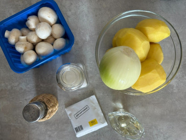 Калорийность продуктов: Картошка, Шампиньоны, Лук, Растительное масло, Соль, Специи сухие