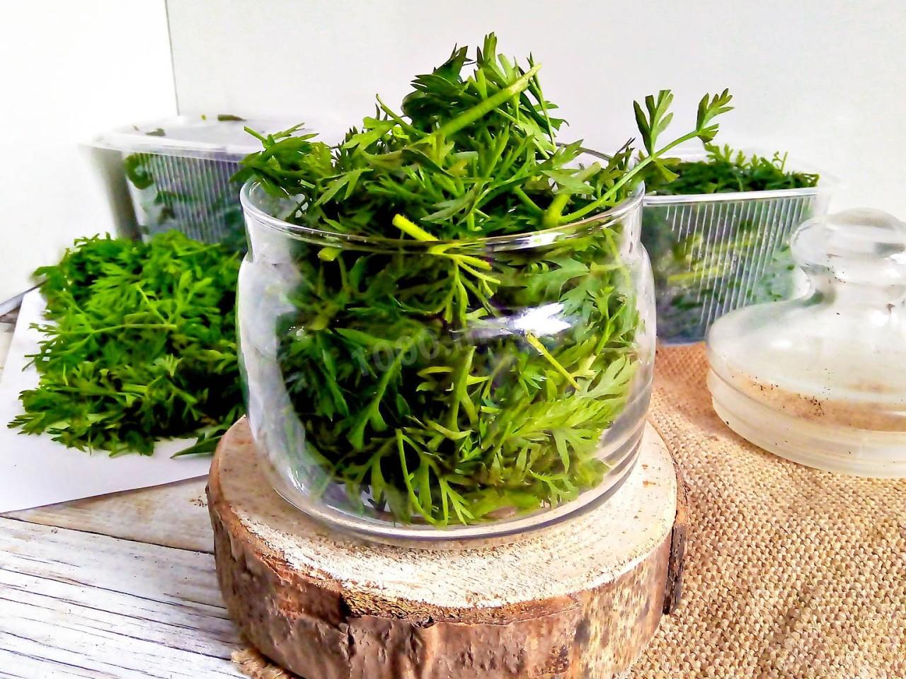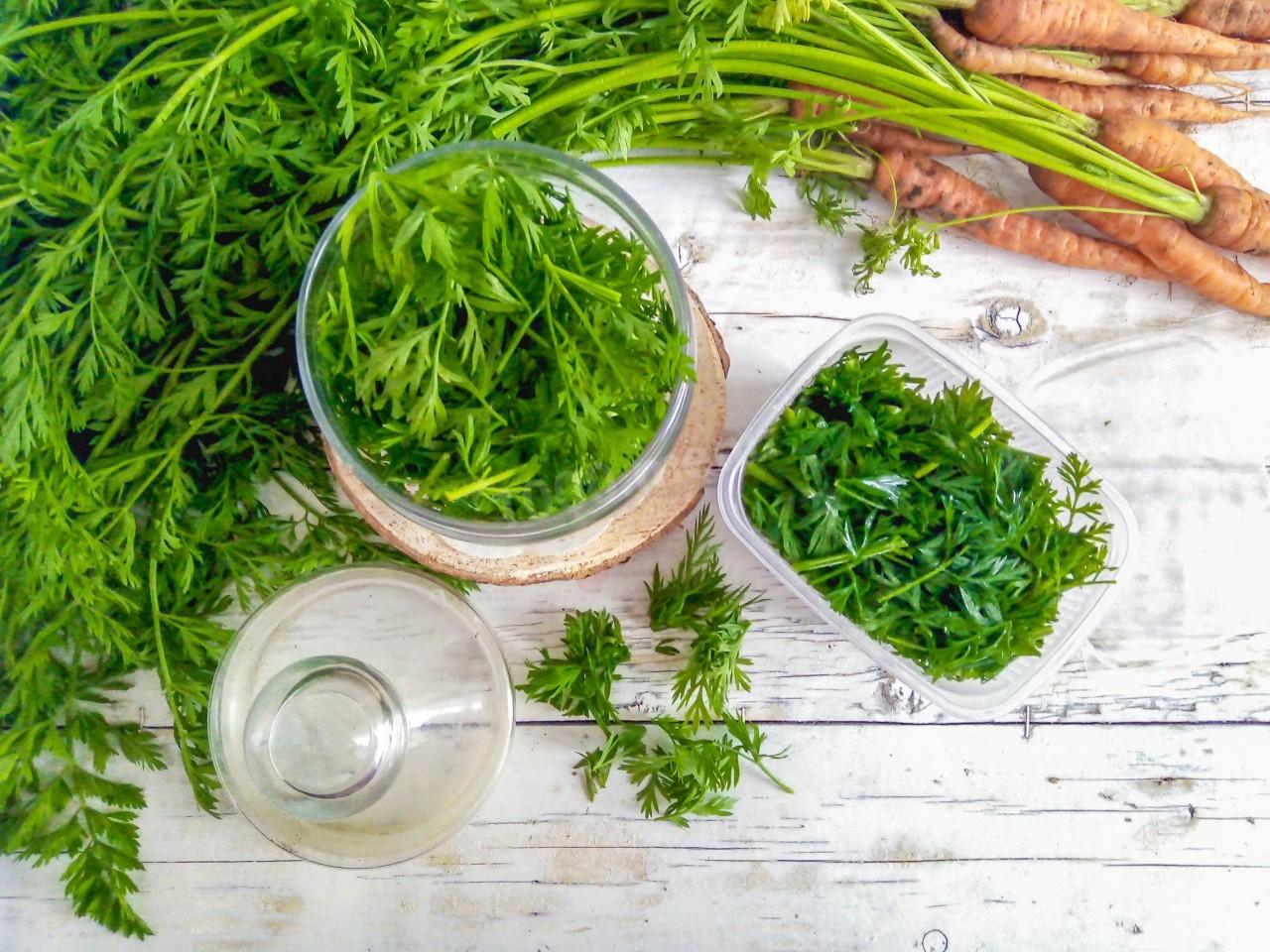 Кроме сушки морковную ботву замораживают. Для этого зелень также помойте, просушите бумажными или хлопчатобумажными полотенцами. Морковную ботву мелко нарежьте ножом, равномерно и свободно разложите на тарелки или в плоские контейнеры и отправьте в морозильную камеру на полчаса. Это нужно сделать, чтобы зелень не замерзла одним большим куском, и зимой было удобно брать ее небольшими частями для приготовления блюд.