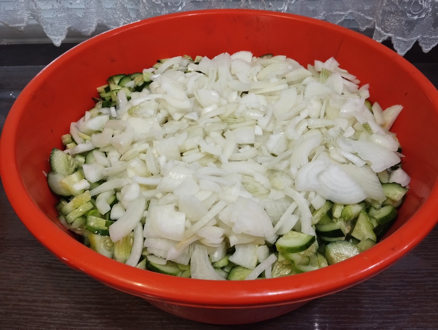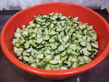 Воду с огурцов слейте. Огурцы еще раз промойте. Нарежьте огурчики на кружочки толщиной не более 0,5 сантиметра. Если огурцы крупные, то дольки можете разрезать еще на половинки.