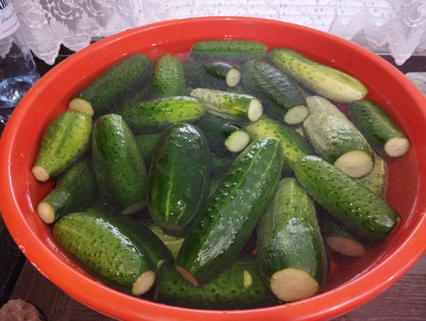 Огурцы тщательно вымойте, переложите в глубокую емкость, залейте холодной водой и оставьте на 2 часа. За это время поменяйте воду хотя бы один раз, залив овощи свежей холодной водой. Это сделает огурцы в заготовке хрустящими и вкусными.