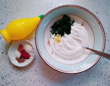 В миску положите сметану. Добавьте зелень и чеснок. Добавьте горчичный порошок, соль, черный молотый перец, паприку, для баланса вкуса добавьте немного сахара.