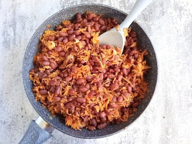 Лука и моркови взяла по две штуки, чтобы получилось сочнее. Жарила на небольшом огне, так овощи прожарятся равномерно. Потом выложила в сковороду фасоль, чтобы при остывании все хорошенько пропиталось.