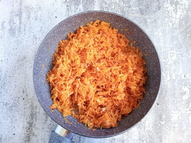 Пока лук на сковороде, вымойте и очистите морковь и натрите на терке. Когда лук станет прозрачным, добавьте натертую морковь. Хорошенько перемешайте лук с морковью и жарьте до готовности еще 1-2 минуты.