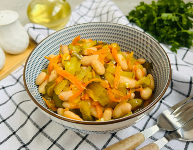 Для приготовления салата фасоль огурцы морковь, решила использовать белую консервированную фасоль. Лук мелко нарезала, морковь натерла на крупной терке и обжарила на растительном масле до мягкости моркови. Огурцы нарезала соломкой, добавила соль и черный молотый перец. Смешала все ингредиенты. Салат получился легким, но в то же время достаточно питательным. Обязательно попробую другие варианты этого блюда, возможно, добавив какие-нибудь новые ингредиенты. Спасибо за отличный рецепт!
