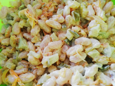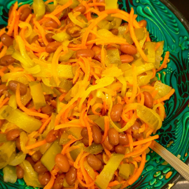 Лук с морковью придаст салату сладковатую нотку, фасоль мягкую плотную консистенцию, а огурцы добавят в салат хрустящий эффект, сочность и кислинку.