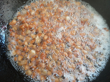 Готовлю выжарки из сала. Сало отделила от шкурки и мелко порезала. Посолила, переложила в глубокую чугунную сковороду, закрыла крышкой и поставила на огонь. Через некоторое время аккуратно перемешала кусочки сала, чтобы нижние кусочки не прижарились ко дну сковороды. При перемешивании нужно быть очень осторожным, так как сало может брызгаться. Когда выжарки хорошо зарумянились, огонь отключила, через некоторое время аккуратно шумовкой выловила шкварки, вытопившийся жир процедила через сито в отдельную посуду. Хрустящие, ароматные шкварки очень хороши с хлебом и горчицей! Спасибо, Надежда!