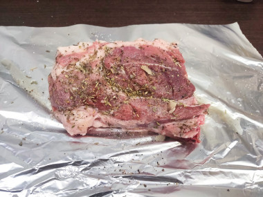 Заверните лопатку в фольгу, поднимая края кверху, чтобы сок не вытекал и переложите в форму для запекания. Я для надежности еще саму форму застелила фольгой. Налейте на дно формы немного воды. Это нужно, чтобы мясо сохранило сочность и не пересохло во время запекания. При этом в само мясо вода попасть не должна.
