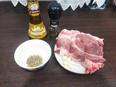 В мясе сделала надрезы,в которые вложила пластины чеснока. Натерла мясо солью, специями,полила маслом растительным и винным белым уксусом.