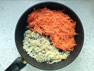 Добавьте к луку тертую морковь и все перемешайте. Обжаривайте овощи на небольшом огне 5-7 минут. Помешивайте, чтобы они не начали подгорать.