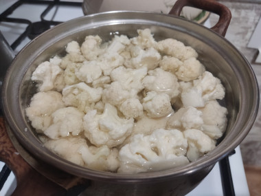 Капусту хорошо промойте под проточной водой. Можете даже замочить ее ненадолго в воде. Разберите кочан капусты на соцветия. Это просто: переверните капусту вверх кочерыжкой и срежьте поочередно маленькие кочанчики. Если соцветие слишком крупное, разрежьте его на несколько частей.