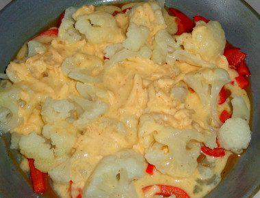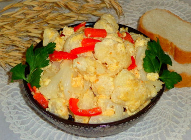 Мягкая и ароматная капуста, быстро жарится на сковороде. Цветная капуста на сковороде с яйцом - это очень вкусное и питательное блюдо. Капусту сначала отварила в воде, чтобы она не была жесткой. Добавила обжаренный болгарский перец. Он капусте придает особый аромат. Капусту подавала с котлетами. Очень вкусно, спасибо за рецепт!