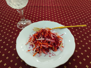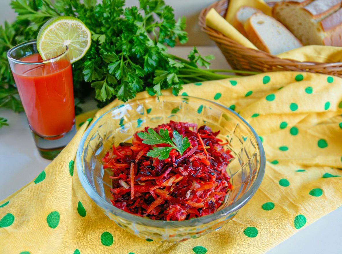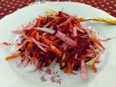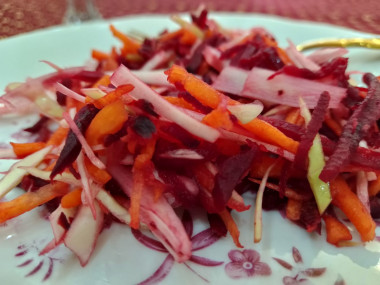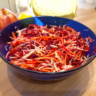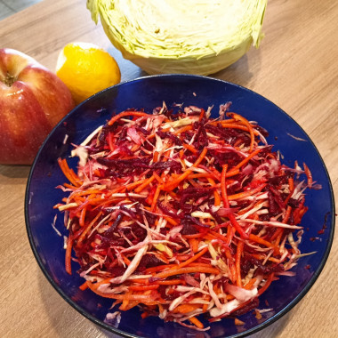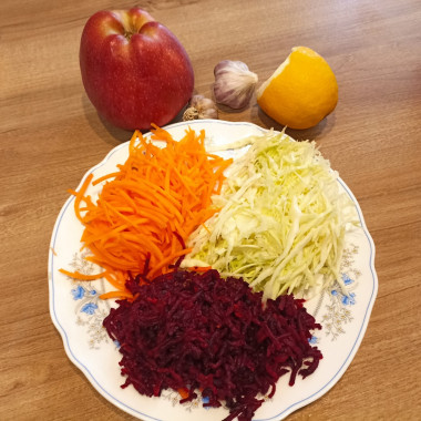 Салат Метёлка для похудения и очищения кишечника, да и просто для удовольствия! Он такой вкусный и полезный, что я готовлю очень часто. Благо, овощи все наши, родные, не заморские диковинные. Сегодня я в салат добавила яблоко и 2 зубчика чеснока, а в заправку лимонный сок. Капусту, хоть и брала молоденькую, слегка помяла, чуть-чуть. Мне очень нравится альянс яблоко+лимон, свекла+чеснок, морковка+капуста. А вместе гармоничный, великолепный секстет получается. Дала постоять часик. Какой же он сочный получился! А какие яркие краски и вкус, объедение! Рекомендую, это не просто вкусно, но ещё и полезно! Автору большое спасибо и за рецепт и за полезные советы!