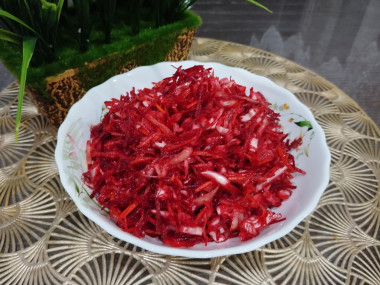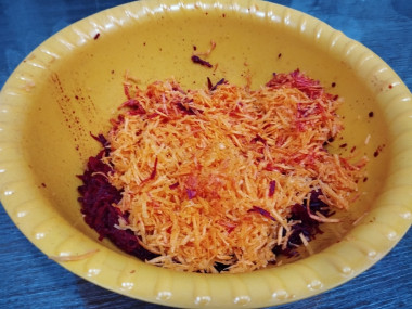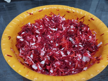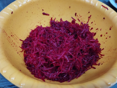 Свеклу помойте, очистите и натрите на мелкой терке. Все овощи лучше натирать на мелкой терке, чтобы салат легче было пережевывать.