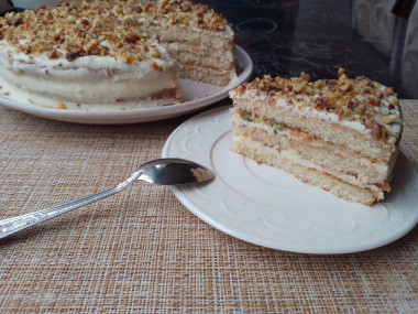 Верх и бока торта обсыпьте орешками. Оставьте на столе минут на 30 для пропитки, затем уберите его в холодильник хотя бы на пару часов для дальнейшей пропитки и охлаждения, удобно оставить торт на ночь.
