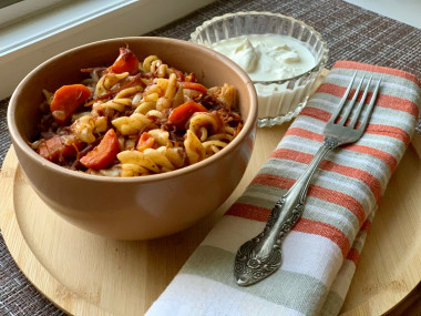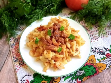 Захотела приготовить ужин на скорую руку. Нужно было что-то мясное, а вот времени размораживать мясо не было. Меня выручила банка тушенки, которая была у меня в запасе и подходящий к моему случаю рецепт - паста с тушенкой.