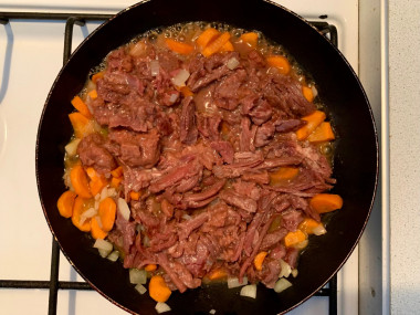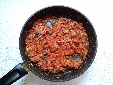 Откройте банку тушенки и выложите её содержимое в сковороду к овощам. Разомните тушенку вилкой на небольшие кусочки или оставьте крупные — по вашему вкусу. Всё хорошенько перемешайте. Тушите мясо и овощи на среднем огне под закрытой крышкой примерно 10 минут. За это время тушенка хорошо прогреется и станет мягкой и нежной. О том, как подобрать сковороду, а также как правильно выбрать растительное масло, читайте в отдельных статьях, ссылки в конце рецепта.