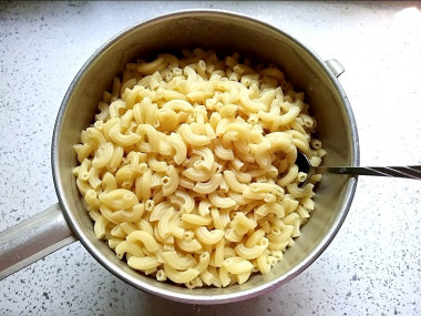 За это время сварились макароны, их отбросила на дуршлаг и промыла водой.