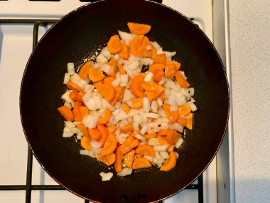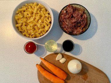 Приступила к готовке. Следовала рецепту. Заранее поставила варить макароны до состояния аль-денте. Нарезала кубиком морковь и лук,обжарила до золотистого цвета лука и мягкости моркови. Тушенка мне по вкусу без бульона,поэтому я,вылив его,взяла только мясо и добавила к овощам. Смешала все с соевым соусом и кетчупом (в рецепте томатный соус,но его у меня не оказалось). Побоялась пересолить, поэтому соль добавлять не стала. На мой вкус тушенка и соевый соус и так имеют достаточно соли в составе. Чеснок я выдавила через пресс и добавила вместе с соусами. Накрыла мясо с овощами крышкой и тушила 10 минут.