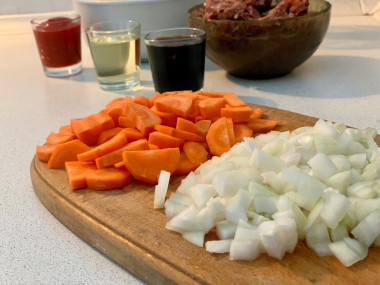 Как сделать пасту с тушенкой? Подготовьте все необходимые ингредиенты. Макароны лучше использовать из твердых сортов пшеницы. Они полезнее и не развариваются. С выбором поможет статья по ссылке в конце рецепта. Начните с подготовки овощей. Очистите лук и морковь, промойте их и обсушите полотенцем. Лук нарежьте кубиками или соломкой, а морковь — крупными кусочками.