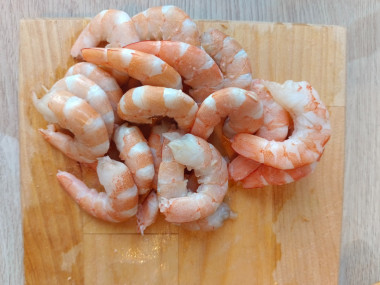 Подготовьте креветки — оторвите голову, снимите панцирь. Хвостик можете оставить. Я обычно отрываю его. Сделайте по спинке надрез острым ножом и выньте кишечную нить. Очищенные креветки промойте под проточной водой, а затем хорошо обсушите, чтобы лишняя влага не мешала им обжариться. И будьте готовы к тому, что их объем сильно уменьшится. Учитывайте это при расчете количества порций.