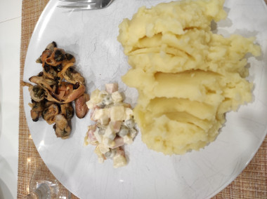 Давно мы не брали мидии, а тут решили порадовать себя. Жареные мидии на сковороде с луком на всякий случай посмотрела здесь. Воды с мидий у меня было прилично, часть стекло, часть выкипела. Жаль не было петрушки, она отлично подходит. Ну и картошечка, как же без неё!
