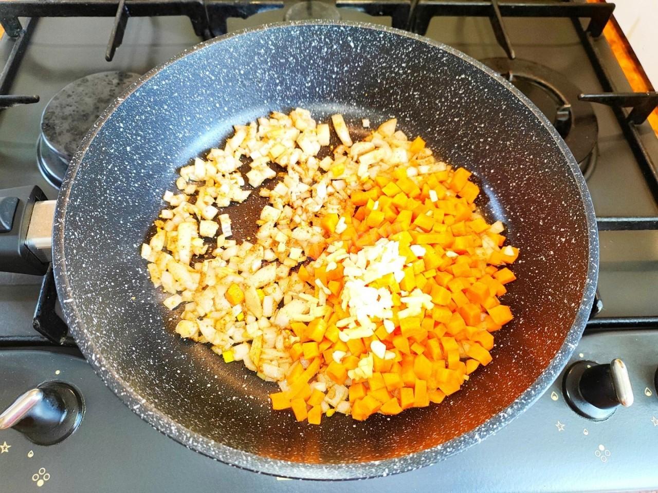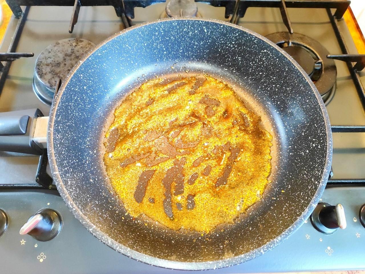Кичри с машем начинается с кокосового масла, в котором прожаривается тмин и горчица в ожидании овощей (лука и моркови).