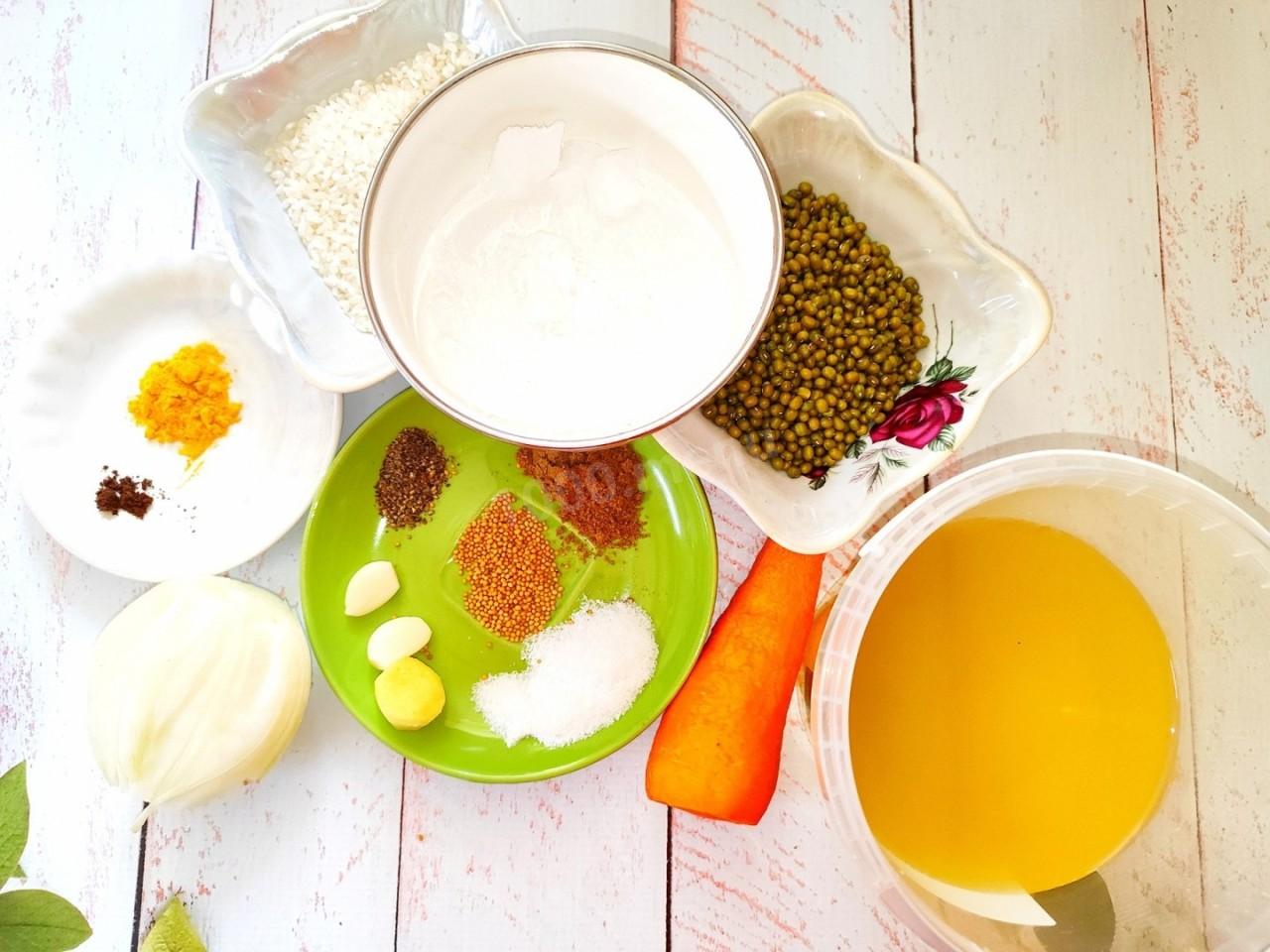Как сделать кичри с машем? Подготовьте ингредиенты. Рис лучше использовать Басмати, но можно взять и любой другой. О сортах риса читайте в конце рецепта. Также подготовьте кастрюлю с толстым дном или большую глубокую сковороду. Лук, морковь, чеснок и имбирь очистите и обмойте. Лук нарежьте небольшими кубиками, чеснок мелко нарубите ножом. Морковь нарежьте маленьким кубиком. Имбирь натрите на мелкой терке. Хорошо промойте рис и маш до прозрачности воды.