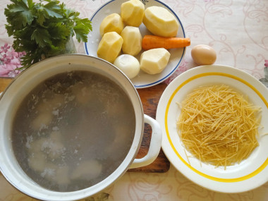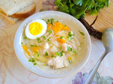 На обед решила приготовить куриный суп с лапшой и яйцом по этому рецепту. Бульон варила на курином филе, порезав кусочками. Лук с морковью обжарила на постном масле до мягкости. Отдельно отварила яйца вкрутую. Добавила в бульон картошку и поджарку, варила до готовности картофеля. В конце засыпала вермишель паутинка. Из специй клала соль и лаврушку. Перед подачей в каждую тарелку супа положила половинку варёного яйца и посыпала измельчённой зеленью петрушки.