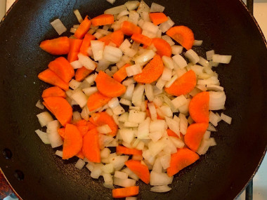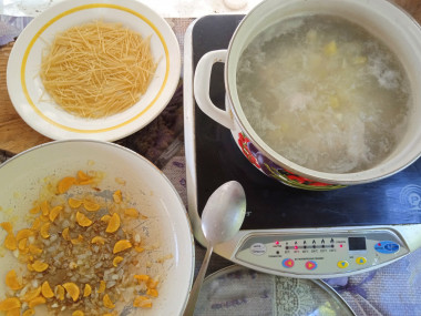 В это время подготовьте зажарку из лука и моркови. Очищенный овощи измельчите удобным способом и обжарьте пару минут с добавлением небольшого количества растительного масла. Подготовьте яйцо. Его можно в сыром виде взболтать в миске и вылить в кипящий суп. А можно отварить и добавлять в таком виде. Нам по вкусу заранее сваренное яйцо. Добавьте зажарку и яйцо в суп. По вкусу подсыпьте соль и специи.