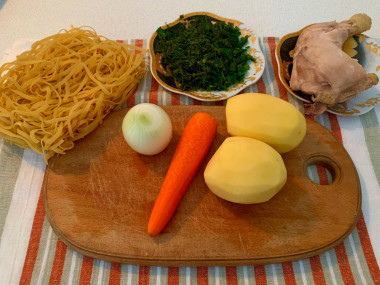 Как сварить куриный суп с лапшой и яйцом? Подготовьте для этого необходимые ингредиенты. Для супа можно использовать любые части курицы или просто порубить целую курицу на части. Лапшу можно взять готовую или приготовить самостоятельно. Под шагами вы найдете ссылку на рецепт домашней лапши.