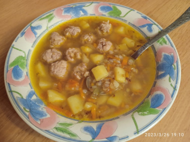Обычно суп с фрикадельками варю с вермишелью или рисом, а вот гречку добавляла первый раз. Я люблю эту крупу, поэтому и суп с нею понравился тоже. У меня не оказалось лука порея, использовала обычный репчатый, а вот все остальные вкусовые коренья и специи были в наличии, они приятно дополнили блюдо. Спасибо за рецепт, loboda.