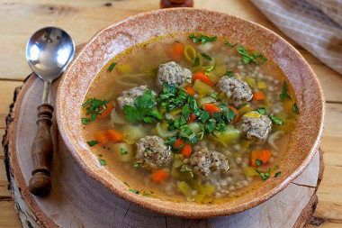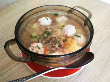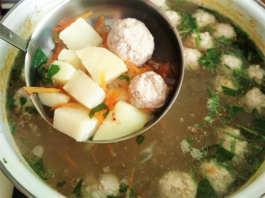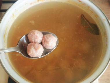 Как только бульон проварится в течение 15 минут, добавьте к супу фрикадельки. Помешайте, чтобы они не прилипли ко дну, и варите еще 10 минут на слабом огне до готовности фрикаделек. Когда фрикадельки будут готовы, добавьте практически готовую гречку, варите суп еще около 5 минут и выключите. Оставьте готовый суп под закрытой крышкой на 10-15 минут.