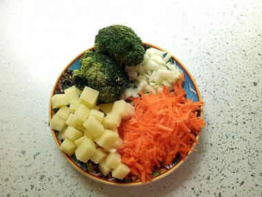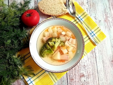 Филе я отварила целым куском с кусочком моркови и веточкой петрушки, потом нарезала средними кубиками. Картошку тоже нарезала примерно такими же кубиками и отварила в бульоне. Лук измельчила кубиками, морковь на крупной тёрке, закинула их в кастрюлю и проварила минут 15. Затем выложила кусочки мяса и посолила. Цветная капуста у меня была, но дочка попросила брокколи. Соцветия разрезала на несколько частей, опустила в воду и довела до кипения. Одновременно закинула горсть вермишели - паутинки для большей сытности. Суп постоял под закрытой крышкой минут пять и полностью дошел до готовности. Заодно овощи и мясо насытились ароматным бульоном.