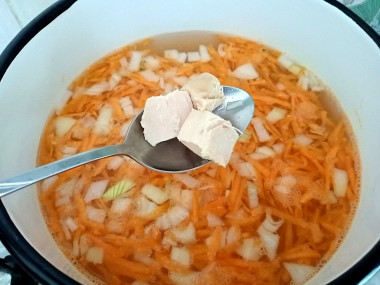 Морковь моем, чистим и нарезаем тонкой соломкой или кружочками, можно просто натереть на терке, кому как больше нравится. По желанию из лука и моркови можно сделать зажарку на масле на сковороде. Но чтобы суп получился более легким и полезным, лучше овощи спускать в суп сырыми, не обжаривая их.