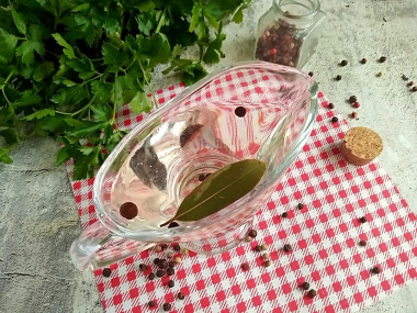 Для самого маринада вскипятила фильтровальную воду с сахаром и солью, добавив лавровые листочки, черный и душистый перец. Уксус взяла обычный.
