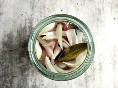 Также вместе с рыбой можно замариновать и лук, нарезанный кольцами, для этого просто положите его в банку со скумбрией и залейте маринадом.