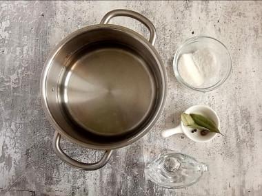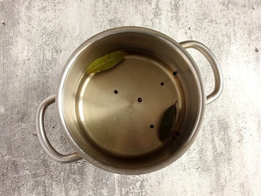 В кастрюльку налейте воду, добавьте соль, сахар, положите лавровый лист и перец. Поставьте кастрюлю на огонь и доводите воду до кипения. Кипятите пару минут, после чего уберите кастрюлю с огня и оставьте до полного остывания.