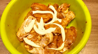 Тщательно перемешайте все кусочки со специями и майонезом. Каждый кусочек курицы должен быть равномерно покрыт маринадом. В таком виде оставьте курицу постоять и замариноваться в течение 1,5-2 часов. Миску накройте пищевой плёнкой, крышкой или тарелкой.