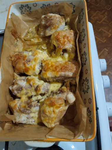 На следующий день запекла куриные кусочки в духовке. Под низ положила пергамент, чтобы ничего не пригорело. Запекла 40 минут при 180°С. Время зависит от толщины и количества мяса.
