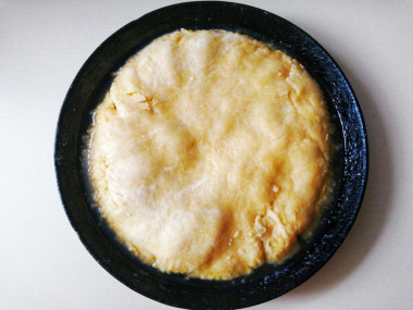 С помощью скалки перенесите тесто прямо на сковороду. Лишнее обрежьте. По краям с помощью вилки аккуратно подоткните тесто, как бы формируя бортики. Наколите вилкой всю поверхность теста.