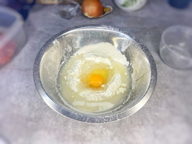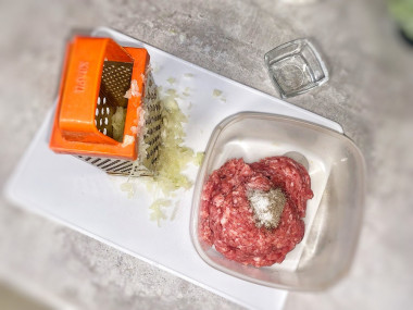 Пока тесто отдыхает, подготовьте фарш. Лук мелко нарежьте. Я тру его на крупной терке. Положите лук к мясу. Посолите, добавьте специи в фарш, затем хорошо вымесите его.