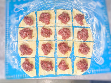 На каждый квадратик выложите комочек фарша. Не жалейте начинки, манты не пельмени)