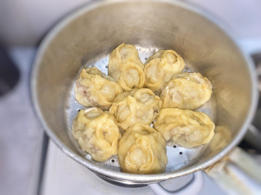 Чтобы манты не прилипли к чаше пароварки, надо каждый мант смазать растительным маслом снизу. Для этого возьмите блюдце и налейте на него чуть-чуть масла. Перед тем, как положить мант, аккуратно проведите его дном по блюдцу. Между мантами оставляйте расстояние, иначе они могут слипнуться. Готовьте манты 45-50 минут.