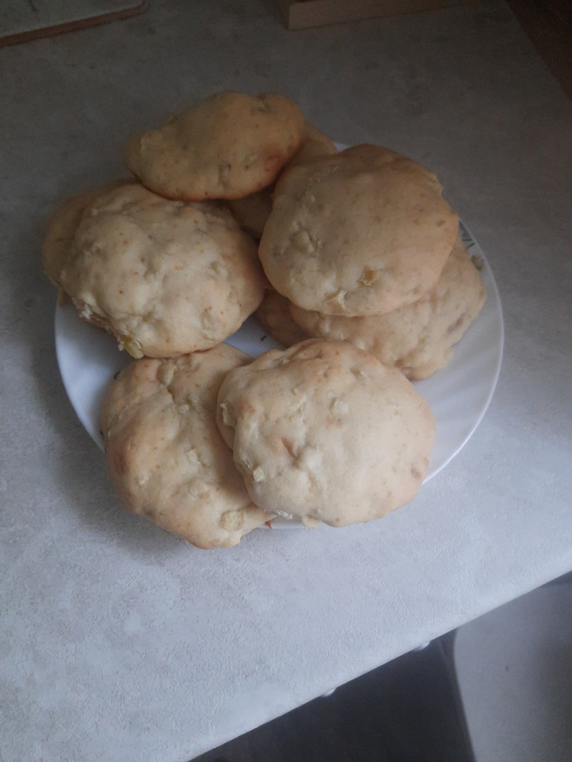 Яблочное печенье на сметане готово! Нужно дать ему остыть и остывшим подавать к чаю или кофе. Приятного аппетита!