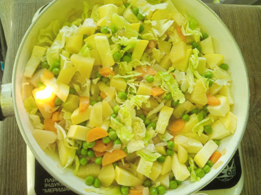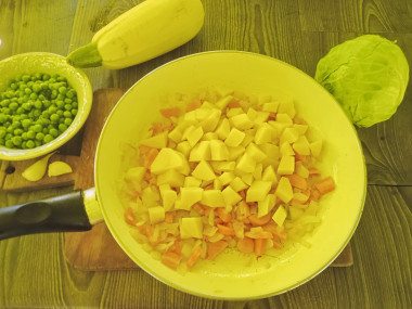 В сотейник или глубокую сковороду положите картофель, морковь и капусту. Влейте четвертинку стакана воды. Поставьте сковороду на огонь. Когда вода закипит, убавьте огонь до среднего и тушите овощи под крышкой около 10 минут, периодически перемешивая. Как выбрать сковороду и масло для арки читайте в отдельных статьях в конце рецепта.