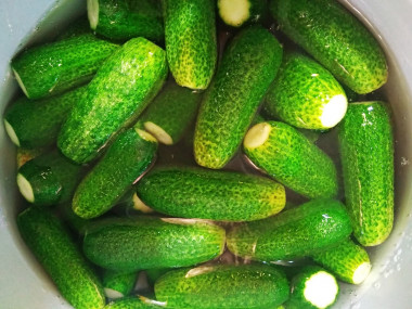Переложите вымытые огурцы в глубокую емкость и залейте чистой холодной водой. Оставьте на пару часов, за это время лучше поменять воду. Затем воду слейте, огурцы еще раз промойте, срежьте у них кончики с обеих сторон.