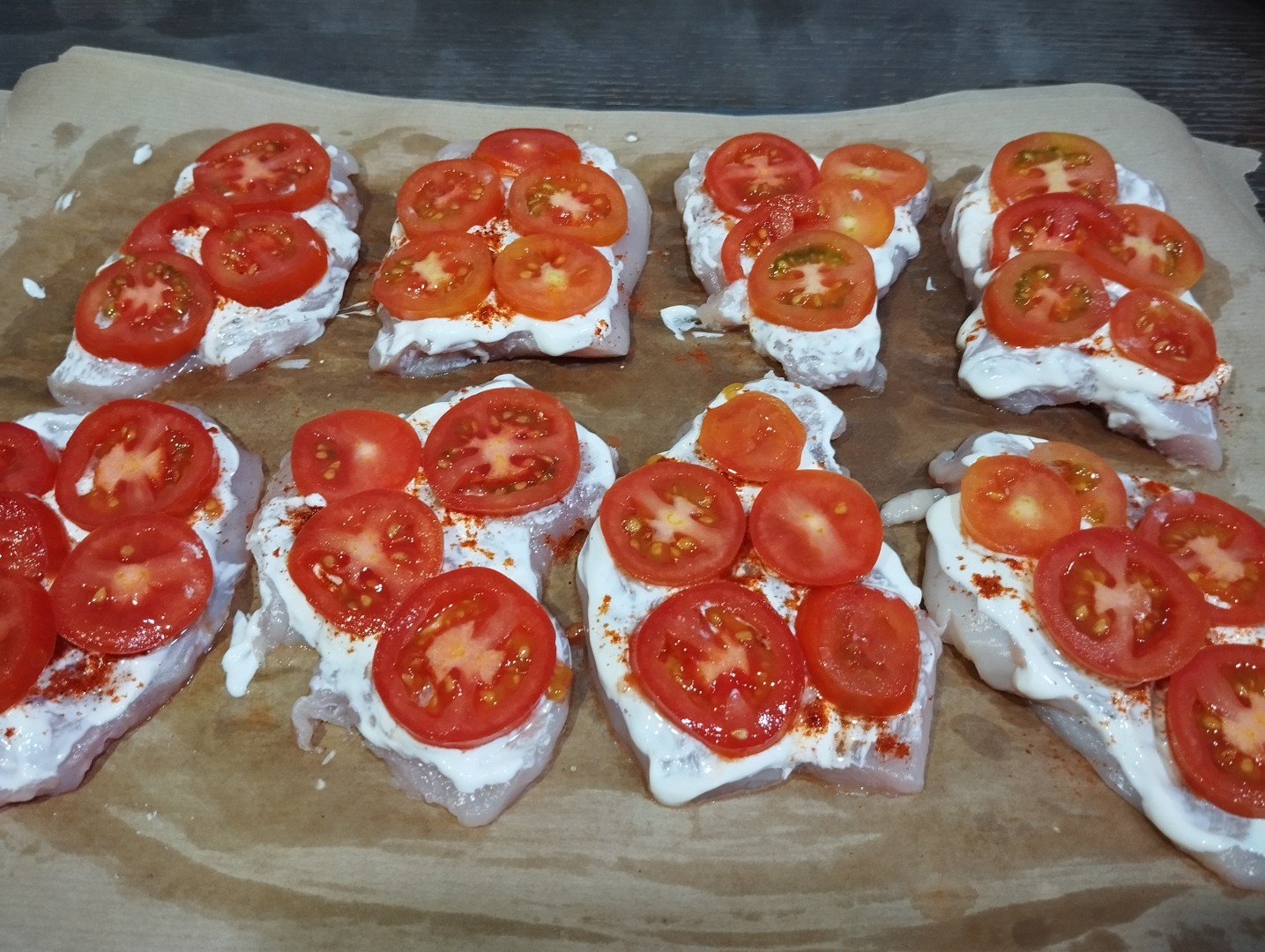 Очень понравился мне рецепт быстротой и простотой приготовления. Минимум времени - это то, что нужно в летнюю жару. Взяла свежее куриное филе и отбила молоточком, накрыв пакетиком. Посыпала курицу приправой для курицы, в ней и соль, и перец, и паприка присутствует. Помидор выбрала плотный и спелый, порезала кружками. Взяла сыр гауда, он вкусный и хорошо плавится, крупно потёрла. На отбитое куриное филе уложила помидоры, посыпала сыром и запекала на деко полчаса в духовке при 180 С.