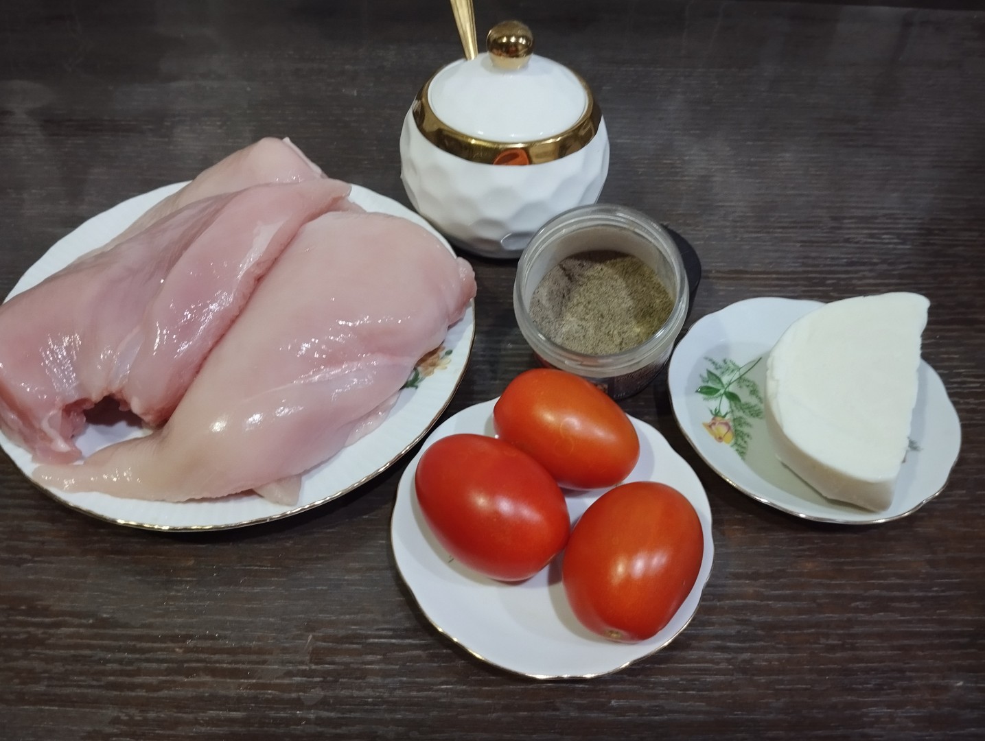 Подготовьте продукты. Идеальным вариантом будет взять филе куриных грудок. Сыр выбирайте любой на свой вкус, главное, чтобы он хорошо терся на терке и легко плавился. Вкус самого сыра внесет свою нотку в готовое блюдо. Выбрать сыр вам поможет статья под рецептом. Чтобы духовка успела нагреться до 200°C, включите её заранее (минут за 10-30 до начала). Помидоры выбирайте сочные, но плотные. Мягкие плоды плохо держат форму и могу испортить внешний вид блюда.