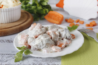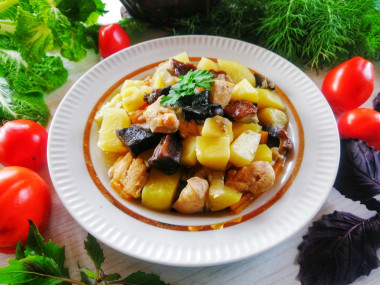 Взяв за основу рецепт жаркое из свинины с картошкой в горшочках с грибами, сделала жаркое в горшочках с курицей. Порезав ее на кусочки, быстро обжарила на растительном масле и выложила в горшочки (у меня было два горшочка по 0,5 л).